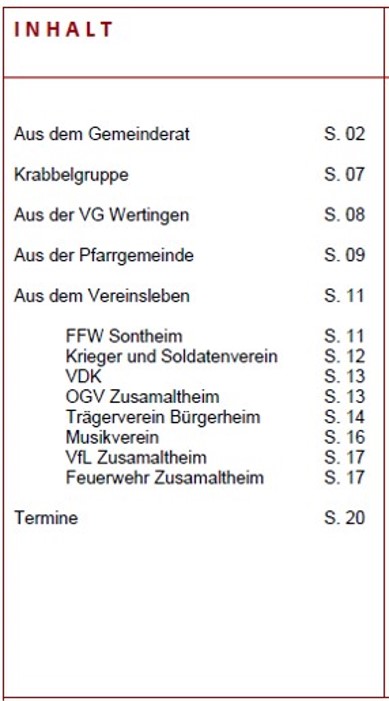 Mit unserem Gemeindeblatt, dem „Zusamecho“, möchten wir Sie immer auf dem Laufenden halten, was in der Gemeinde Zusamaltheim für unsere Bürgerinnen und Bürger wichtig ist. Wir bieten Ihnen das quartalsweise erscheinende Gemeindeblatt hier auf unserer Website zum Ansehen oder Herunterladen an. Beiträge für die nächste Ausgabe des “Zusamechos” können Sie gerne an unseren Bürgermeister (buergermeister@zusamaltheim.de) oder an Judith Deppenwiese (judith.deppenwiese@gmail.com) senden.